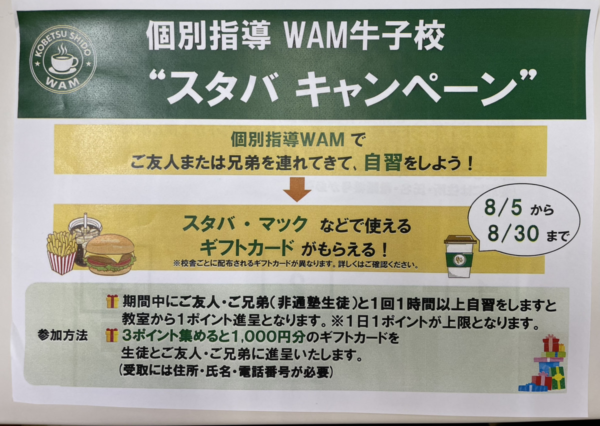 🎄冬期4大キャンペーン実施中! こんにちは!個別指導WAM中村公園校です。 いよいよ冬期講習シーズンが始まります❄️ この冬、勉強の「苦手」を「得意」に変えるための特別キャンペーンを実施中です! 🟣① 4コマ分の講習無料ご招待! お申し込み期間:11月1日(金)〜12月20日(金) 今なら4コマ分(1コマ90分×4回)の授業を無料で体験いただけます! 「どんな先生が教えてくれるの?」「WAMの授業ってどんな感じ?」という方にピッタリです。 🟠② 月謝2ヶ月無料!(先着20名限定) この冬にご入塾いた…