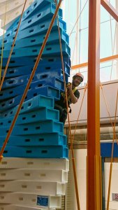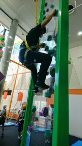 クライミングはちゃんとハーネス(命綱)つけてビル3階分ぐらいの建造物を昇っていきます。