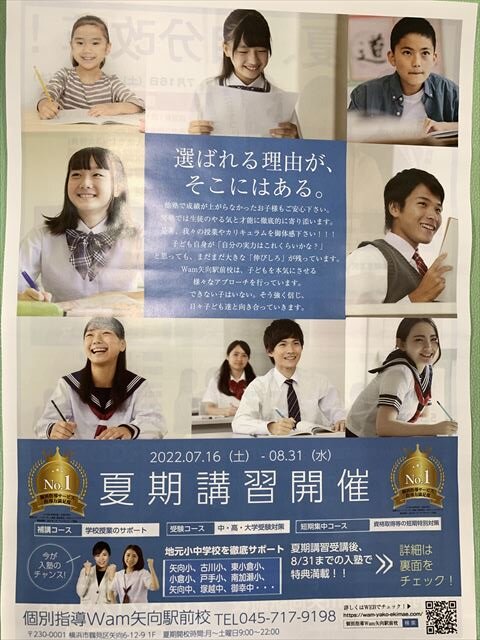個別指導Wam矢向駅前校の👓海坊主です。すみません、すみません、すみませんm(_ _)m。1カ月、ブログやインスタの投稿が行えていませんでした(+o+)・・・。この1か月は夏期講習の各生徒のカリキュラム作成や生徒・保護者様との面談、講師のシフト作成に追われておりましたが、生徒や保護者様、講師陣のご理解・ご協力もあり、それぞれの目的・テーマに沿った夏期講習行っています☆彡その名も「この夏の自分改革!」。夏休みが明けた頃には一皮剥けた自分に出会えるように、朝から晩まで生徒達も講師陣も頑張ってくれています。「わり算の筆算を完璧にする(小4年Aさん)」、「作文力を付ける(小3Bさん)」、「特殊算をマスターする(中学受験コースCさん)」、「中学3年間の履修範囲の総復習を行う(中学3年Dさん)」・・・・。それぞれの目標の為に細かなカリキュラムを作成を作成し、夏期講習期間の進捗を都度確認しながら、自学自習も併せて微調整を行い、日々奮闘中です!!!