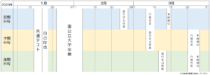下記は全体の流れとなります。大学別に出願・受験・合格発表日が設定されていますので、必ず確認をしましょう。