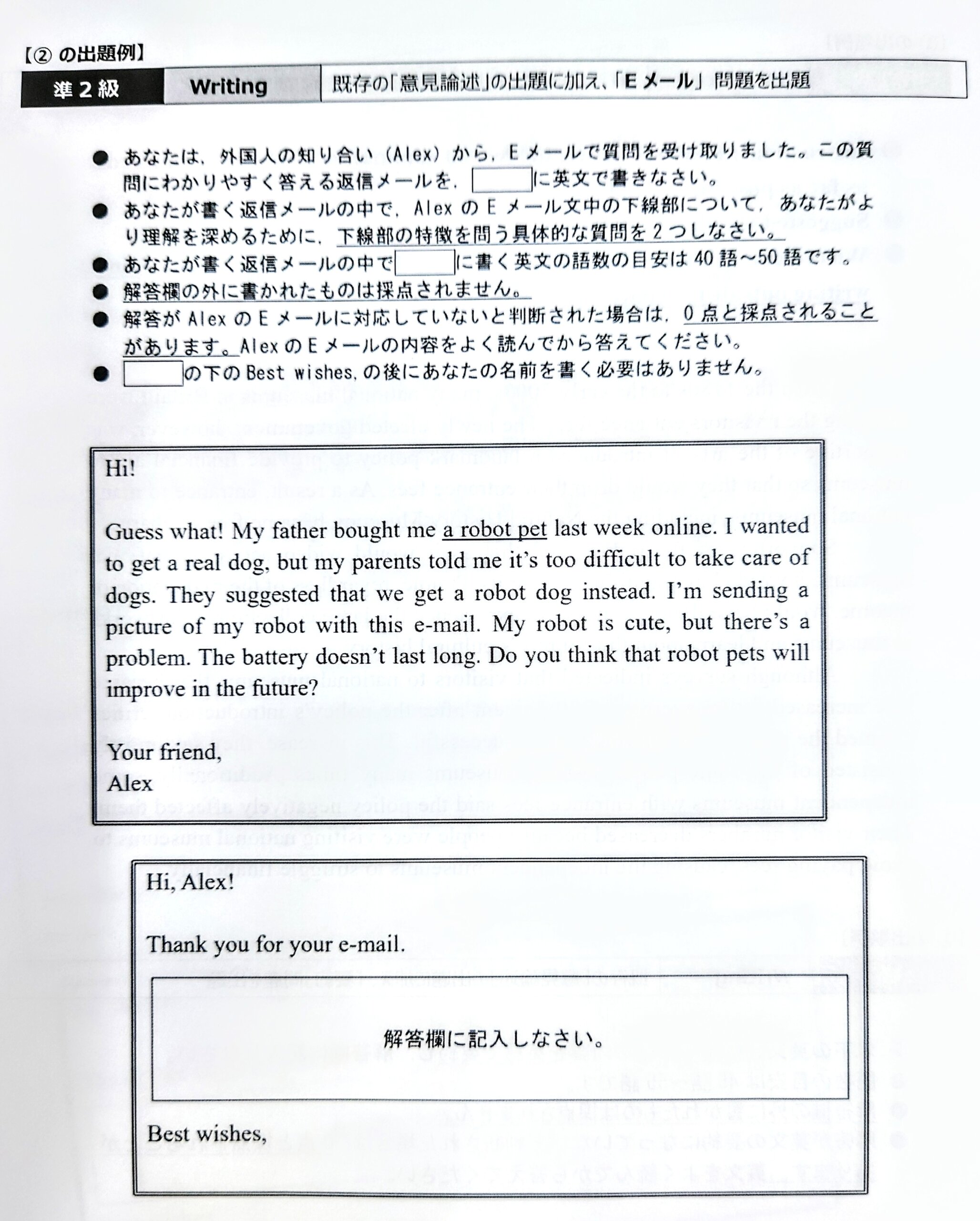・英作文の問題が現在の「意見論述」1題から「意見論述」と「Eメール問題」の2題に増加。