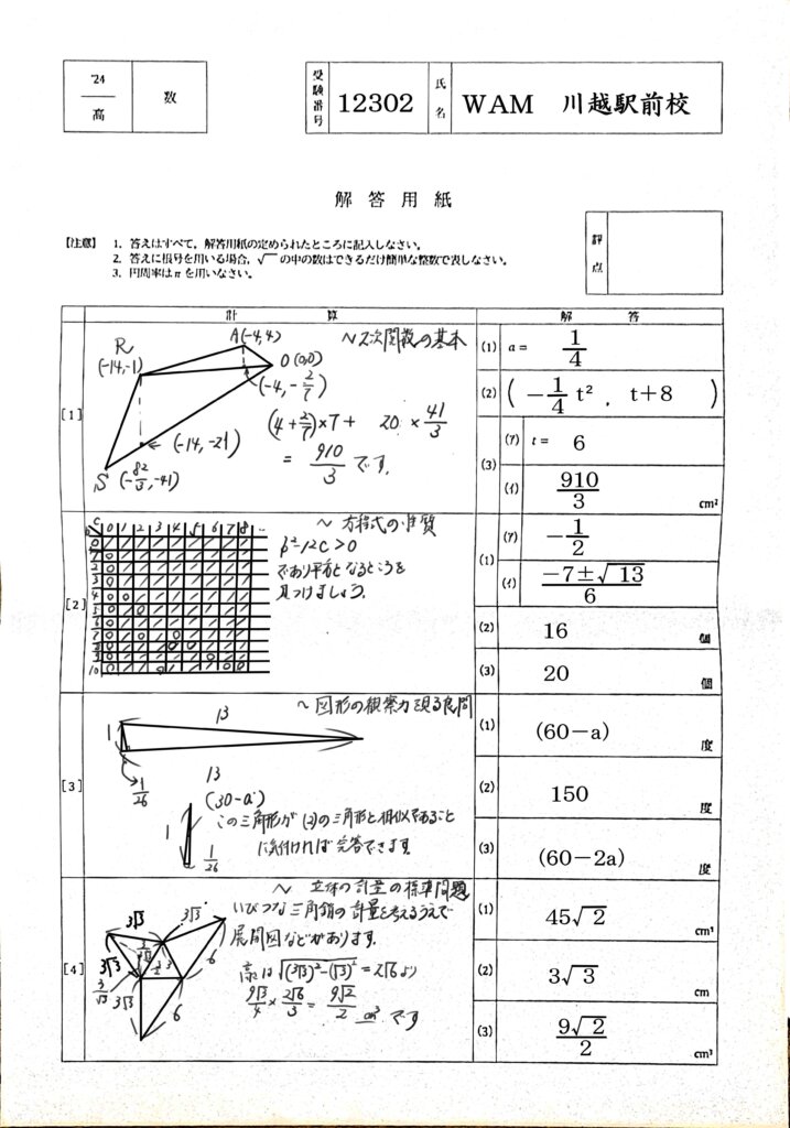 [3]:平面図形は角度をメインに求める新傾向のタイプで、ぱっと見では戸惑った受験生もいたことでしょうが、補助線をヒントに要点を掴めれば完答できる良問です。