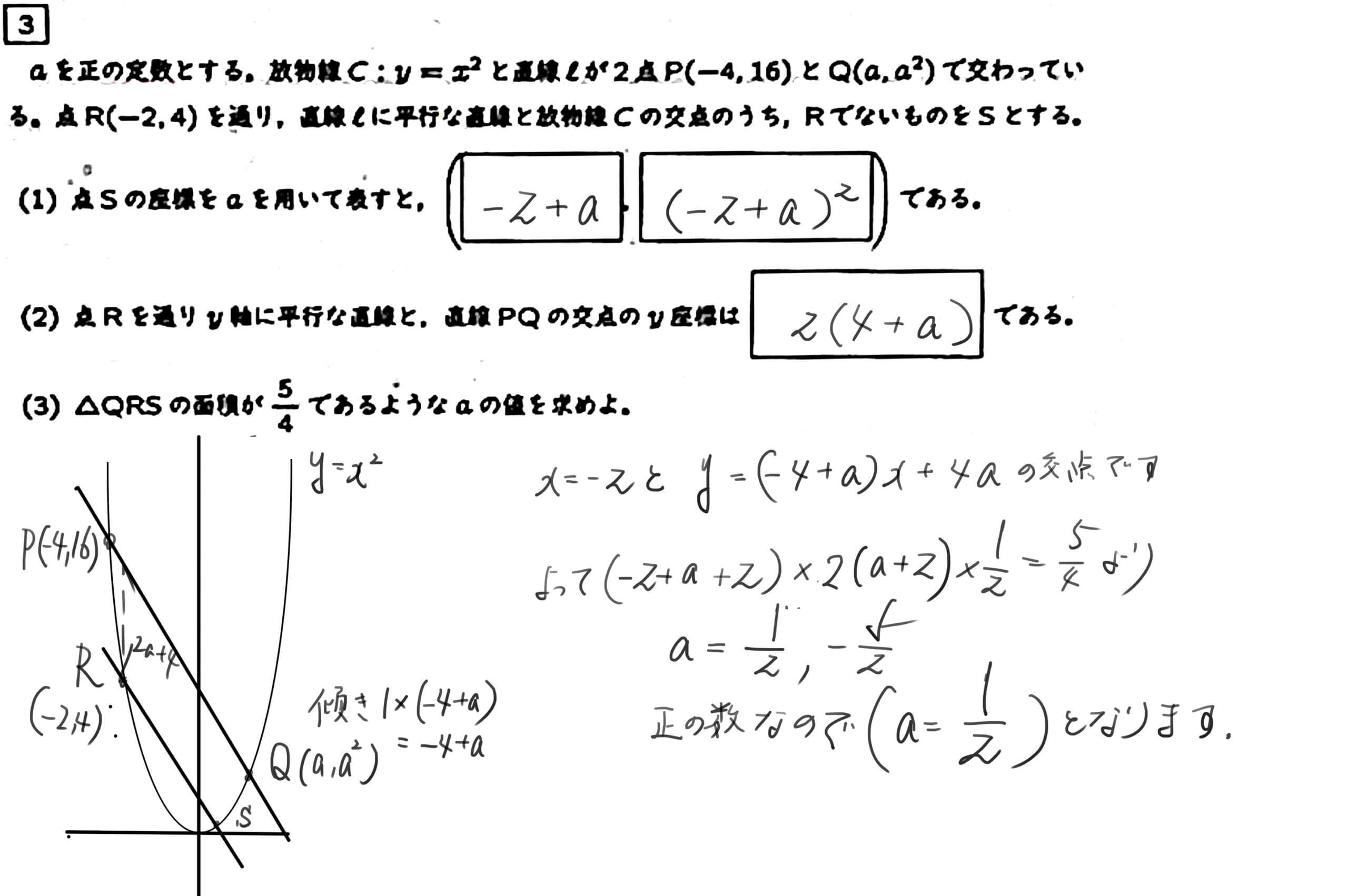 2.この学校ではおなじみの文章題です。見た目はよくある売買に関するものですが、文字が多く計算量も非常に多い難問です。ここの受験生でも戸惑った生徒さんは多かったのではないでしょうか。誘導式とはいえ(1)から答えまでの道が長いので、よほどの自信がない限り初めは飛ばしてもよかったかもしれません。