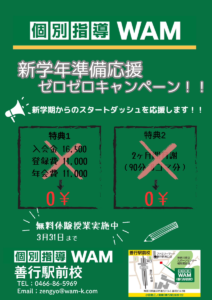 WAM善行駅前校では、新学年のお子様を応援するため、ゼロゼロキャンペーンを実施いたします! 入学金など 38,500円→0円! 2か月分月謝(8コマ分)→0円!この機会にぜひ、まずは体験授業をお申込みください!