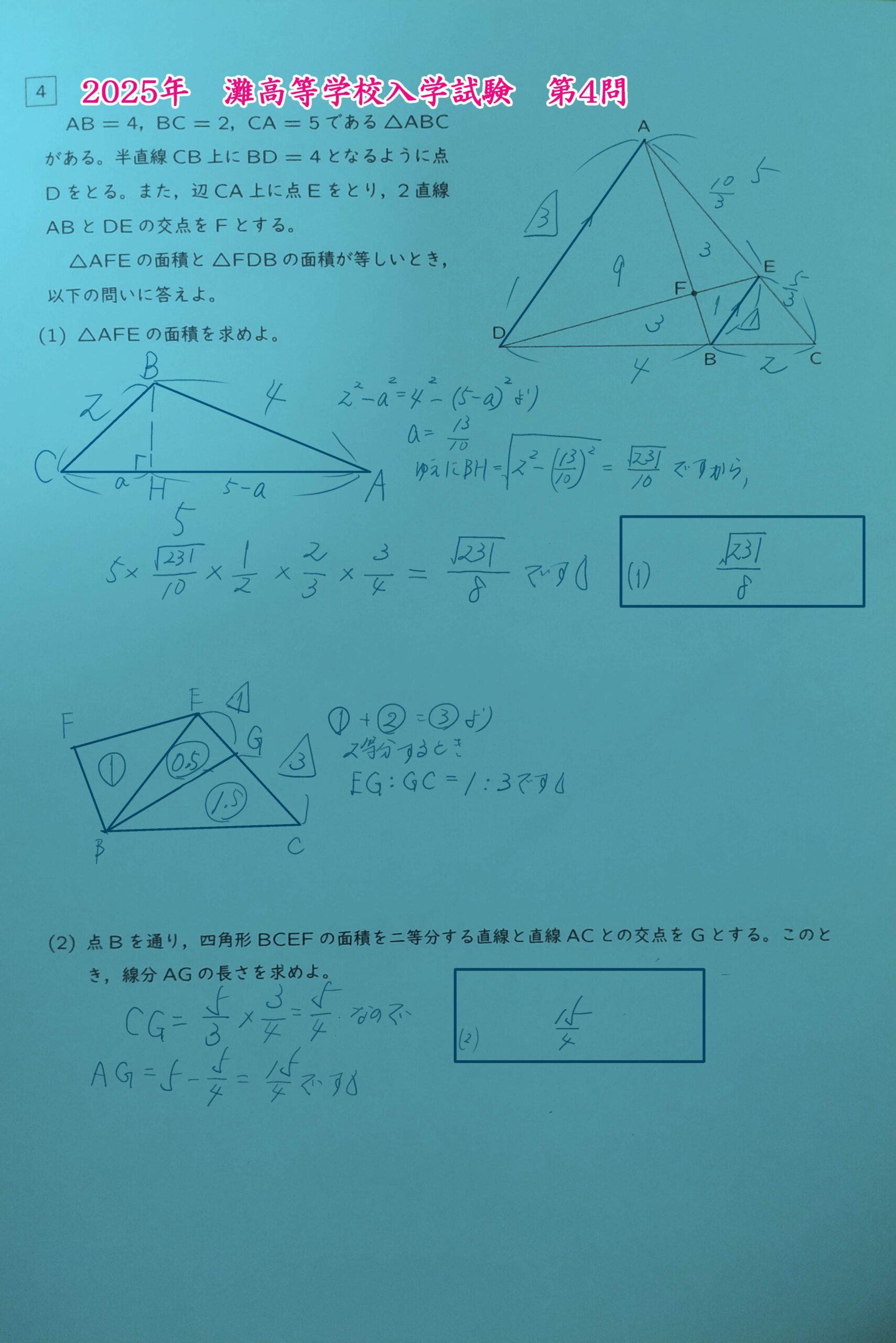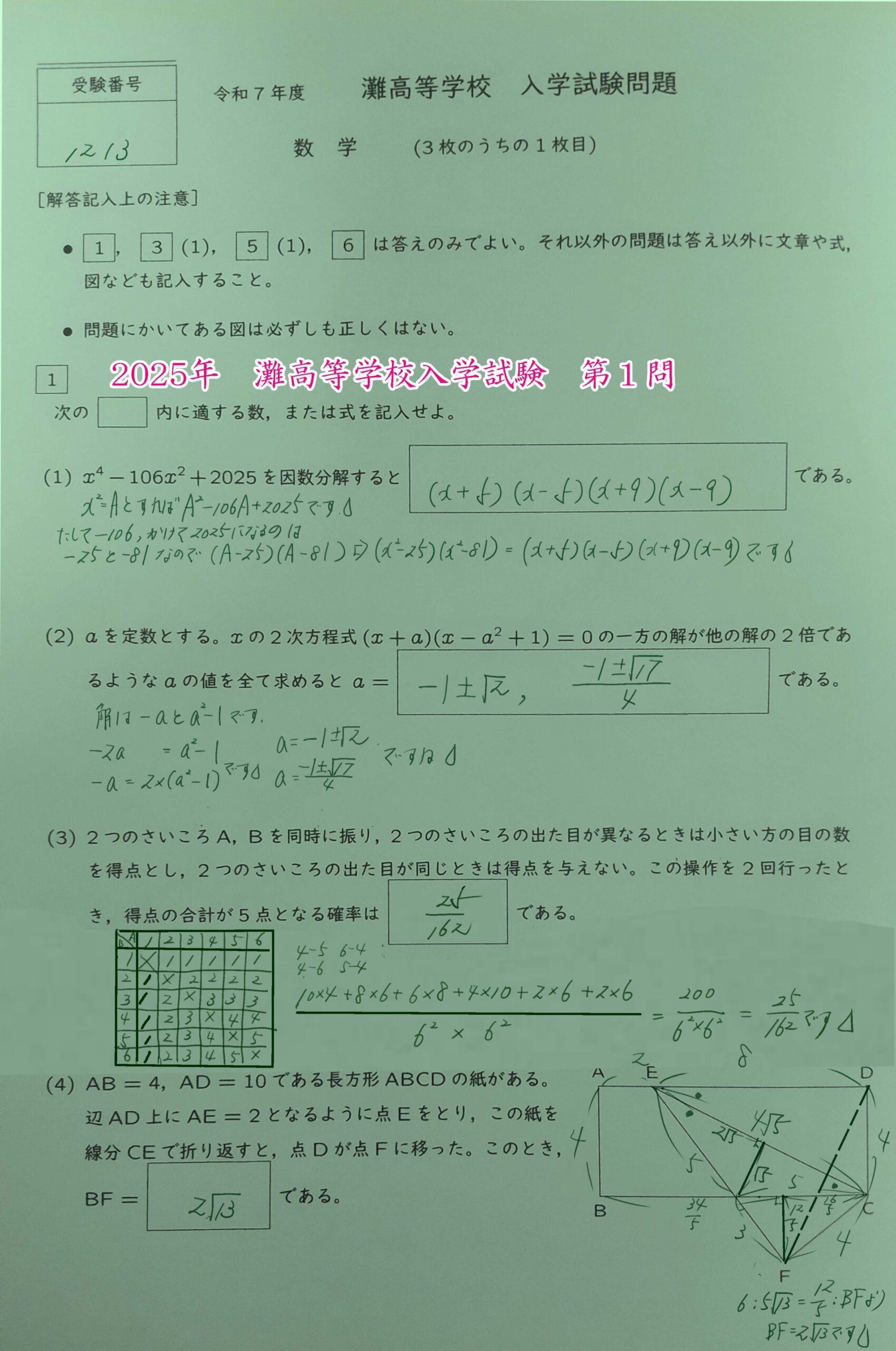 因数分解や二次方程式の解など、しっかりと地に足のついた理解が求められる出題となっています。論証を含め平面図形分野や比例と関数が平易な難度であるのに対し、確率や空間図形分野はレベルが高めです。特に第5問の確率は今年度最大の難問で、この学校の受験生といえど完答者は多くなかったでしょう。