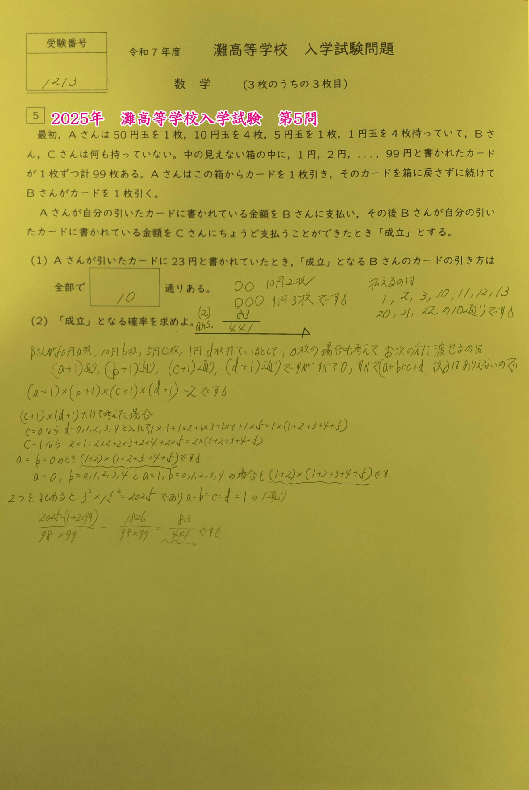 確率は暗記パターンの通用しない単元の1つで、その都度じっくり考えることが必要です。これは高校に入っても同じ姿勢でいなければならないというメッセージでもあるのです。