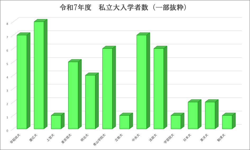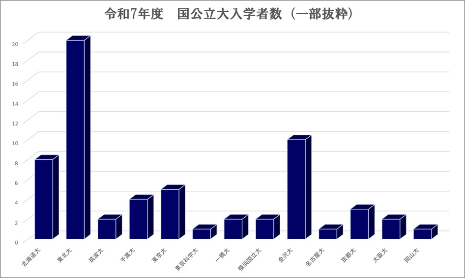 令和7年度における現役の国公立大入学者の内訳(一部抜粋)になります。昨年度の受験生では東大に5名、京大に3名が進学しています。大学群別の割合でみると東京一科が約9%、旧帝大が約30%、筑横千が約6%、金岡千広が約12%という結果となりました。グラフにはありませんが、新潟大や地元・群馬大も多く進学しています。