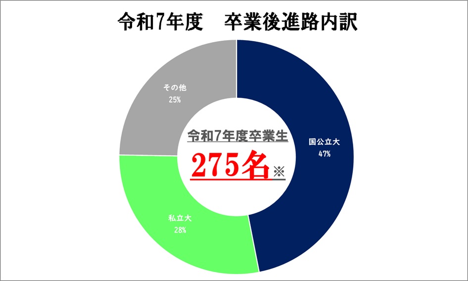前橋高校では、令和7年度卒業生のうち国公立大に47%、私立大に28%の生徒が進学しています。