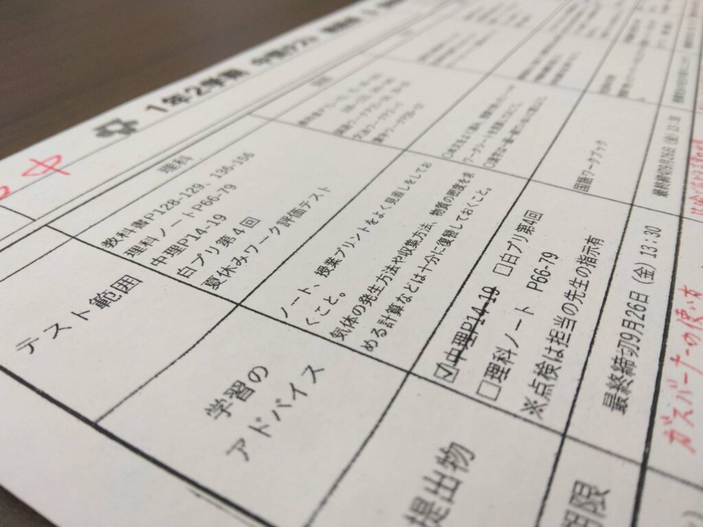 協和中のテスト範囲表を例に挙げると、この「テスト範囲」「提出物」という項目のほかに「学習のアドバイス」という欄があり、「〇〇を何度も繰り返し解いておくこと」などテスト範囲においてプリントを含むあらゆる教材の中でも「特にコレ!」というものが書かれています。