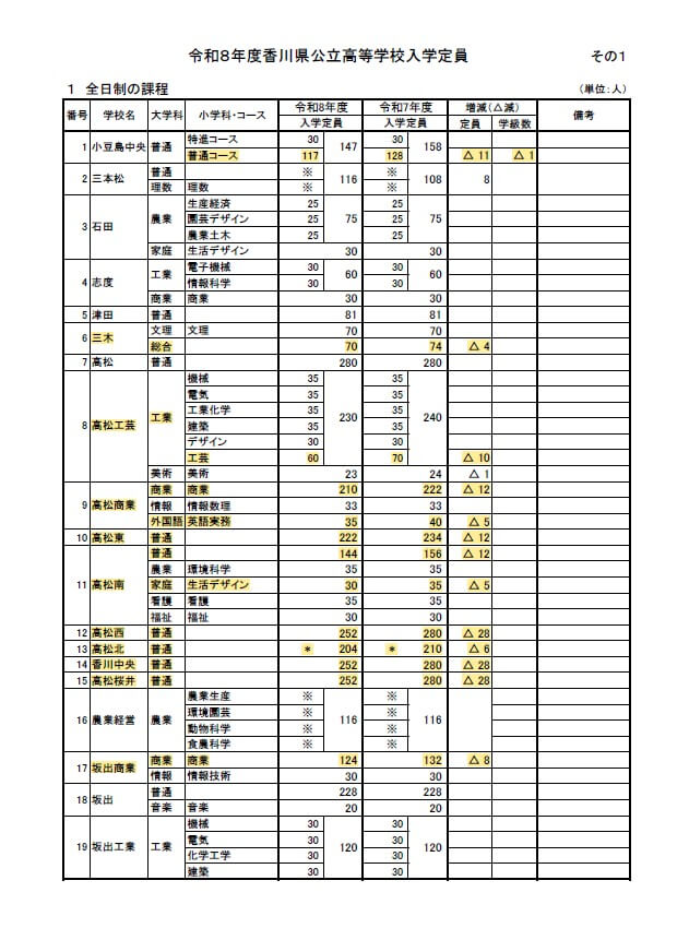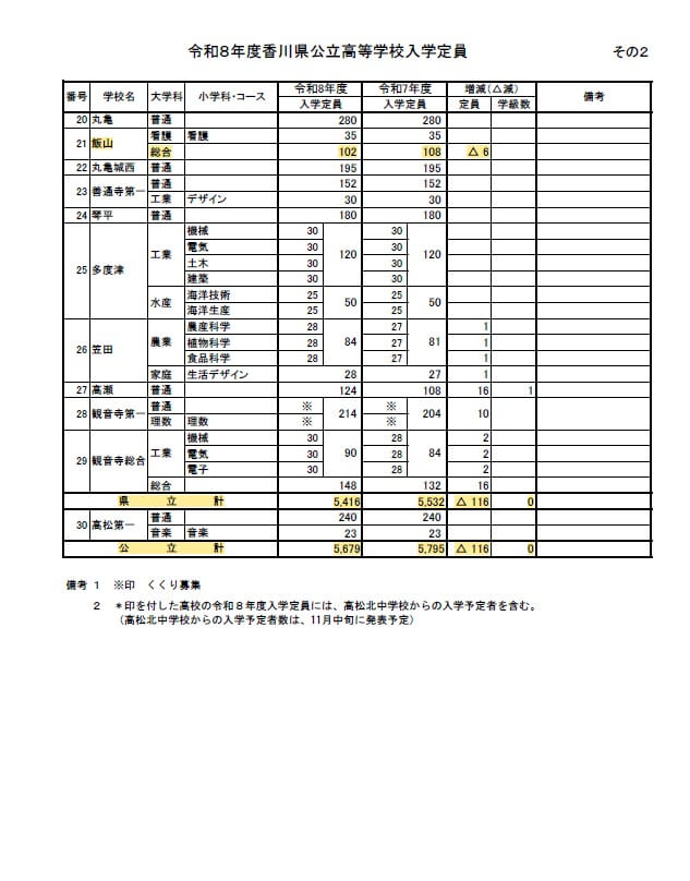 さて先日、香川県の【令和8年度公立高校入学定員】が発表されました。