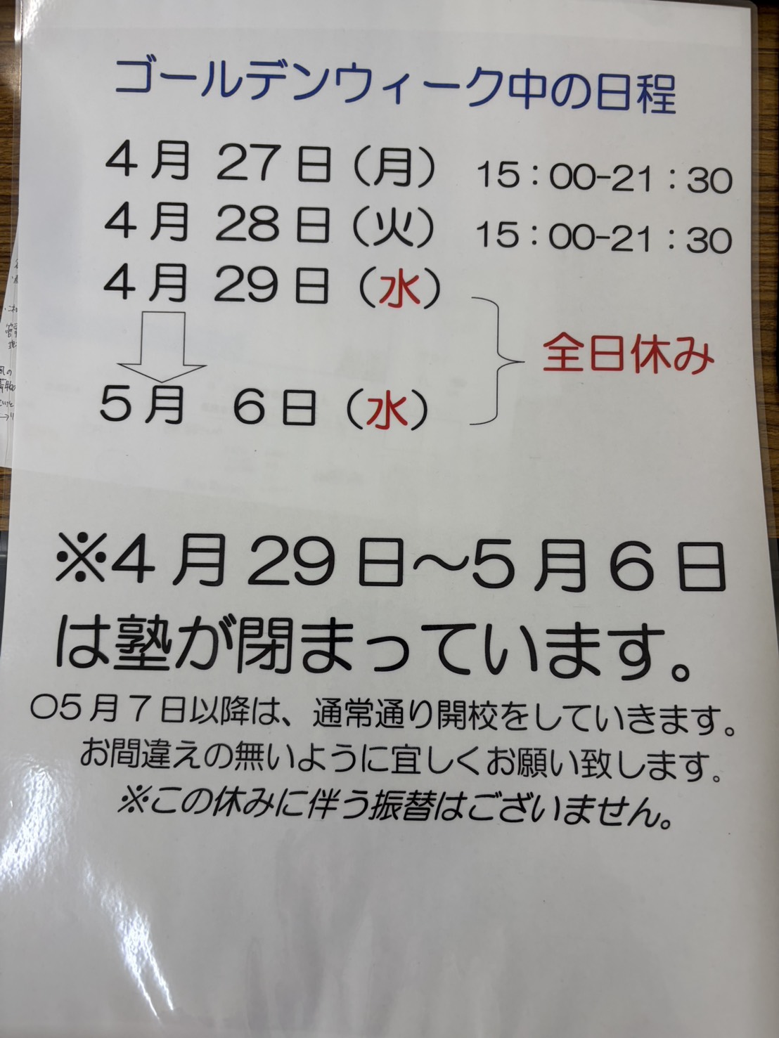 WAM山直校は4/29(水)~5/6(水)までお休みになります!