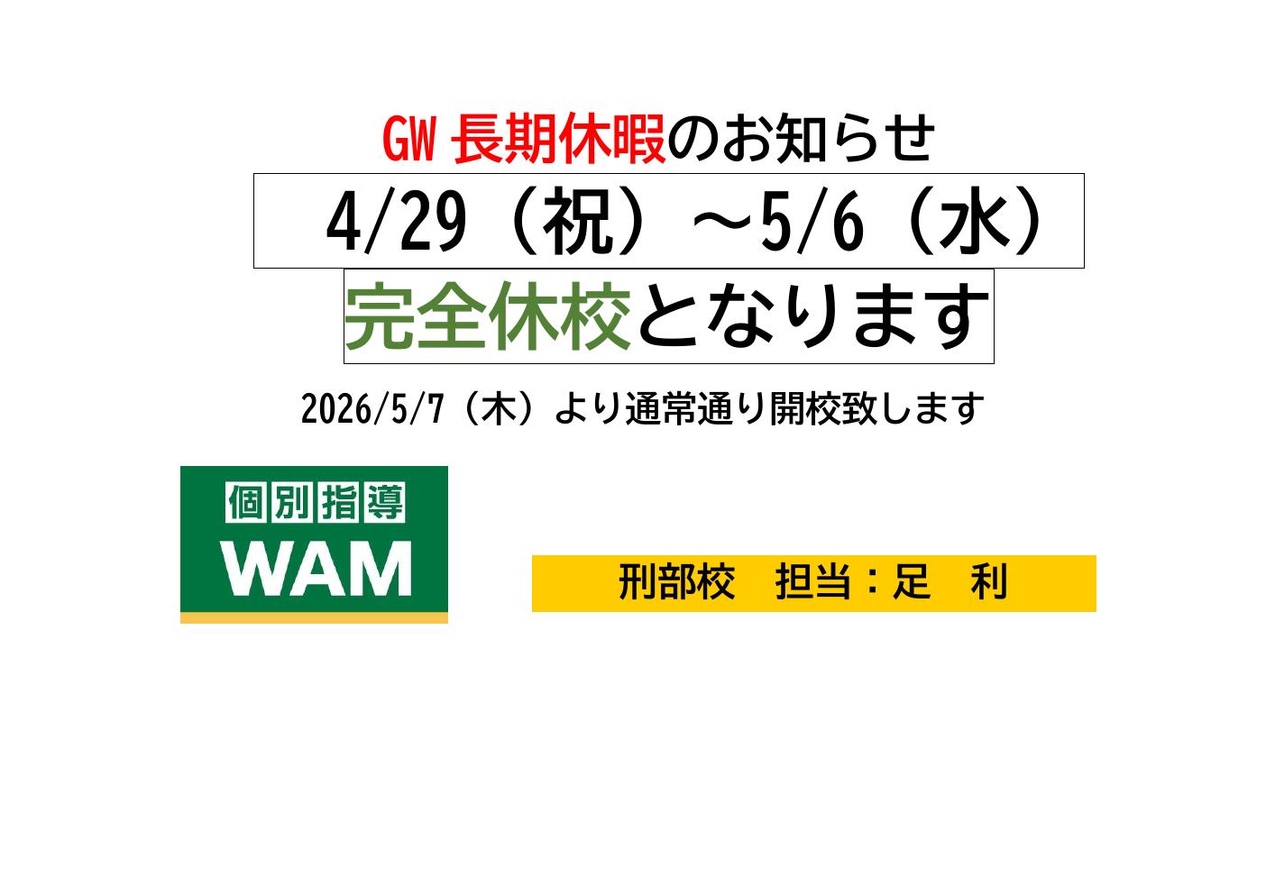 さて、当塾では下記の日程でGW休校をいただきます。