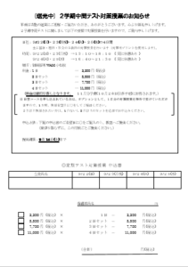 みなさん、こんにちは!大阪市東淀川区にある小松校の林です(^-^) はやいものでもう1月末…「1月往ぬる2月逃げる3月去る」と言いますが、ほんとうですね~~~しみじみ… さて、現在、小松校では中3の学年末テスト対策授業を実施中です!中学生活最後の定期テストということで、みんな悔いの残らないようにがんばっています! このテストが終わったら、いよいよ高校入試です!私立高校や公立高校にむけて、ぎゅうぎゅうに授業がつまっていますが、おそらく( ゚д゚)ハッ!と気づいたら春になっているはず… あたらしい年度に向けて、あと一息!いっしょにがんばりましょう~~~(^0^)/
