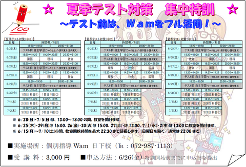 みなさん、こんにちは!日下校の野村です。 個別指導Wam日下校は、東大阪市の北西に位置し、道路をはさんで向かいにある孔舎衙小学校をはじめ、孔舎衙東小学校・孔舎衙中学校そして大東市の四条中学校地区からたくさんの小・中学生,高校生が通塾しています。 先日、夏休み前の学校最後の日を夏休みにしてしまった台風11号が過ぎ去り、今日は“夏”っぽい日です。僕は面談でずっと室内にいているので、あまり夏の空気を感じられていないですが…(汗) いよいよ夏期講習会です!明日からは朝9時から教室を開けています!20日は“海の日”なのでスロースタートと言った感じですが、21日からはWam三昧も始まります(おかげさまでた…