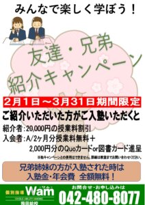 おはこんばんちわっ! 個別指導Wam飛田給校の 『ぺんぎん先生』こと長谷川です。 紹介キャンペーンも2月から始まりました! もし塾を探している人がいたら、是非紹介を お願いします!この機会をお見逃しなく! 詳しくはぜひお問い合わせください! この春を明るい未来への第一歩にするために 飛田給校で一緒に頑張っていきましょう! 「自習室開放」 2月19日(土) 2月23日(水/祝) 2月26日(土) 10時~17時 「学校ワーク完成講座」 2月19日(土) 2月23日(水/祝) 2月26日(土) 17時~21時半 ↓お問い合わせはこちら