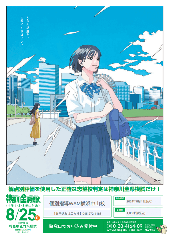 個別指導WAM横浜中山校では、 8月25日(日) に「神奈川県全県模試」を実施いたします。 塾生はもちろん、外部生の方や入塾ご検討中の方でもご受験いただけます! 特に中学3年生にとっては、入試に向けて今の実力を知るために「超重要」な機会です。 ぜひご参加ください! 【 神奈川県全県模試 実施概要 】 ■実施日:2024年8月25日(日) ■実施場所:個別指導WAM横浜中山校 ■対象学年:中学1年生~中学3年生 ■試験時間・試験範囲:学年により異なります。詳細はお問合せ下さい。 ◆◆◆◆◆ また、同日開催と…