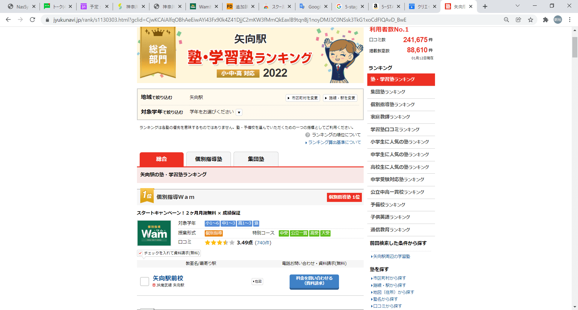 個別指導Wam矢向駅前校の👓海坊主です。先日、日本トレンドリサーチ社が学習塾に関する調査を実施し、Wamが「個別指導サービス 指導力満足度」、「地域密着の個別指導学習塾」、「受験生におすすめのオンライン塾」の3部門で第1位を獲得する事が出来ました。 参照:https://trend-research.jp/14296/ 特に指導力満足度、地域密着という部分については、当校も大切にしている部分ですので、一定の評価が得られた事は嬉しい限りです。この事に満足する事無く、生徒一人ひとりの状況や抱えている悩み・課題、生徒の特長を考慮し、一人ひとりに最適な学習サポートが