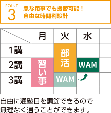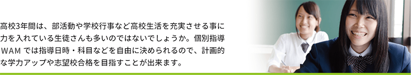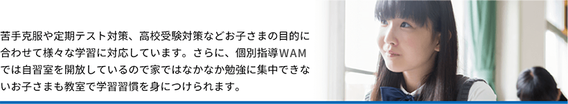 受験生にとっては、たくさんの教科を当日までにいかに効率よく学習できるかが大切です。苦手を克服しながら、定期テスト対策・高校受験の準備とやるべきことはたくさんあります。個別指導WAMならAIが自分専用のオーダーメイドカリキュラムを作成してくれるので、一人で勉強をするよりも確実に効率の良い学習が可能です。さらに志望校合格に近づきます!