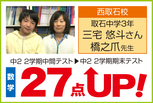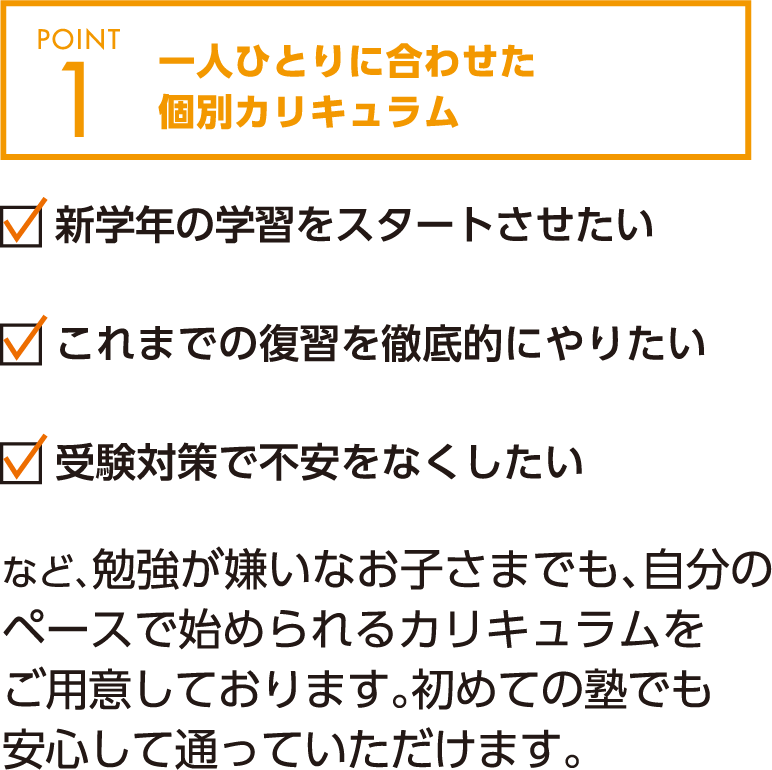 AIを活用して、単元別の習得度を正確に分析して作成された最大効率のオーダーメイドカリキュラムを基に、高品質な個別指導で確かな学力アップを実現します。指導の無い日の学習も明確にアドバイスしてくれるので、自分一人でもしっかり学習内容を定着できる力を養います。普段の授業から定期テストまで、理解度は確実にUPします。