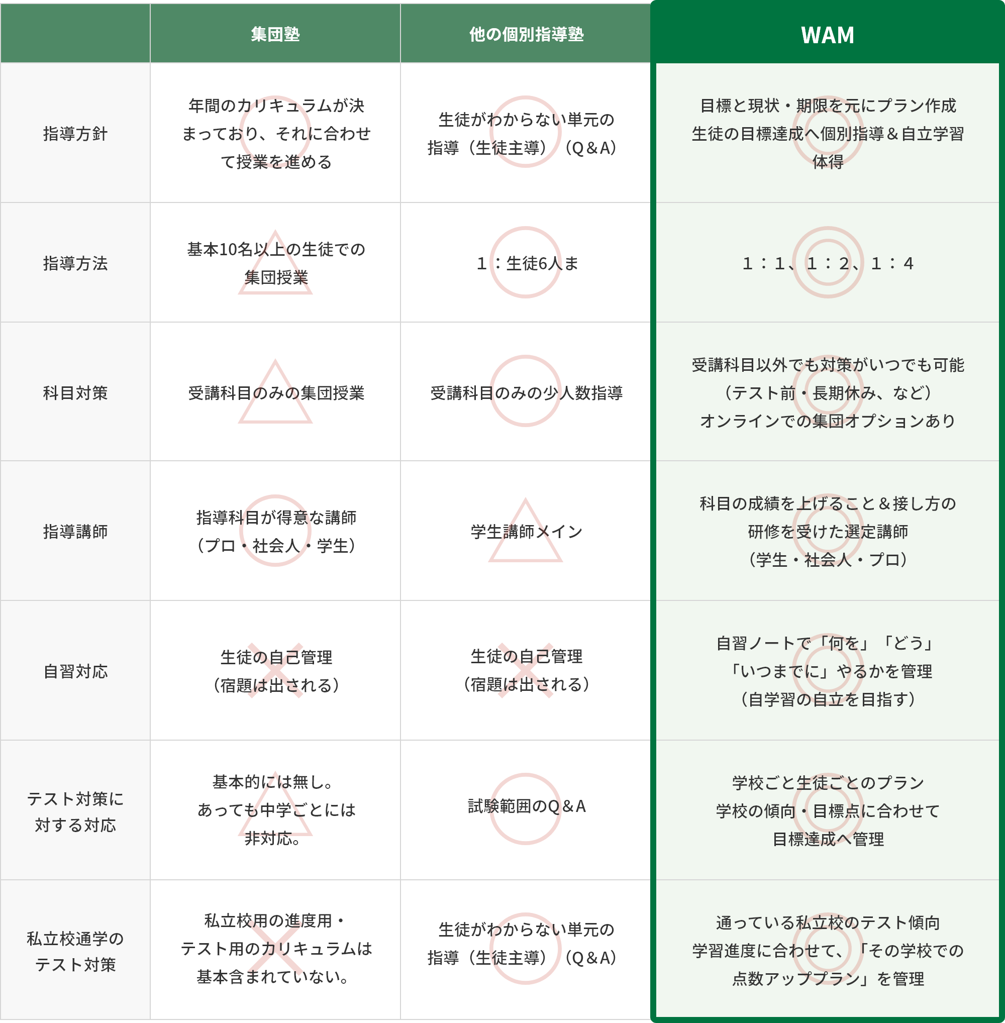 集団塾と他の個別指導塾、個別指導WAMの違いをご覧ください。