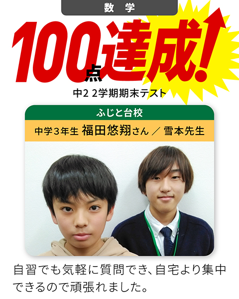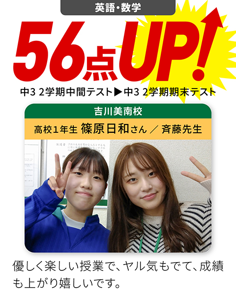 勉強の仕方や成績を上げる対策をしたく中3の夏から通っています。受験や定期テストで使える裏技や解き方のコツなどを教えてくれ、自分のペースに合わせた授業方法でわかりやすかったです。高校では常に90点台をキープできており、今後も楽しみです。