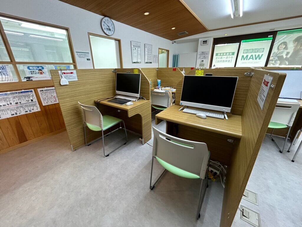 淡路洲本校では、教室開放時間内であればいつでも無料で自習スペースを開放しております。空き状況は日によって異なりますので、詳しくはお電話でお問い合わせください。