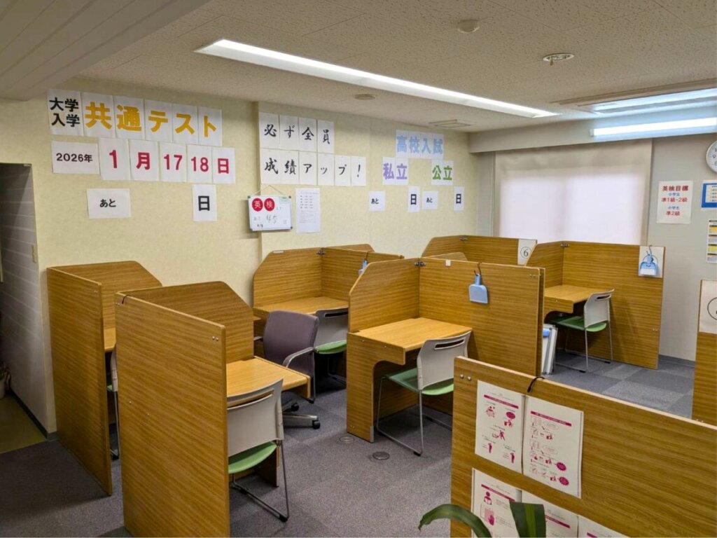 箕面粟生外院校では、教室開放時間内であればいつでも無料で自習スペースを開放しております。空き状況は日によって異なりますので、詳しくはお電話でお問い合わせください。