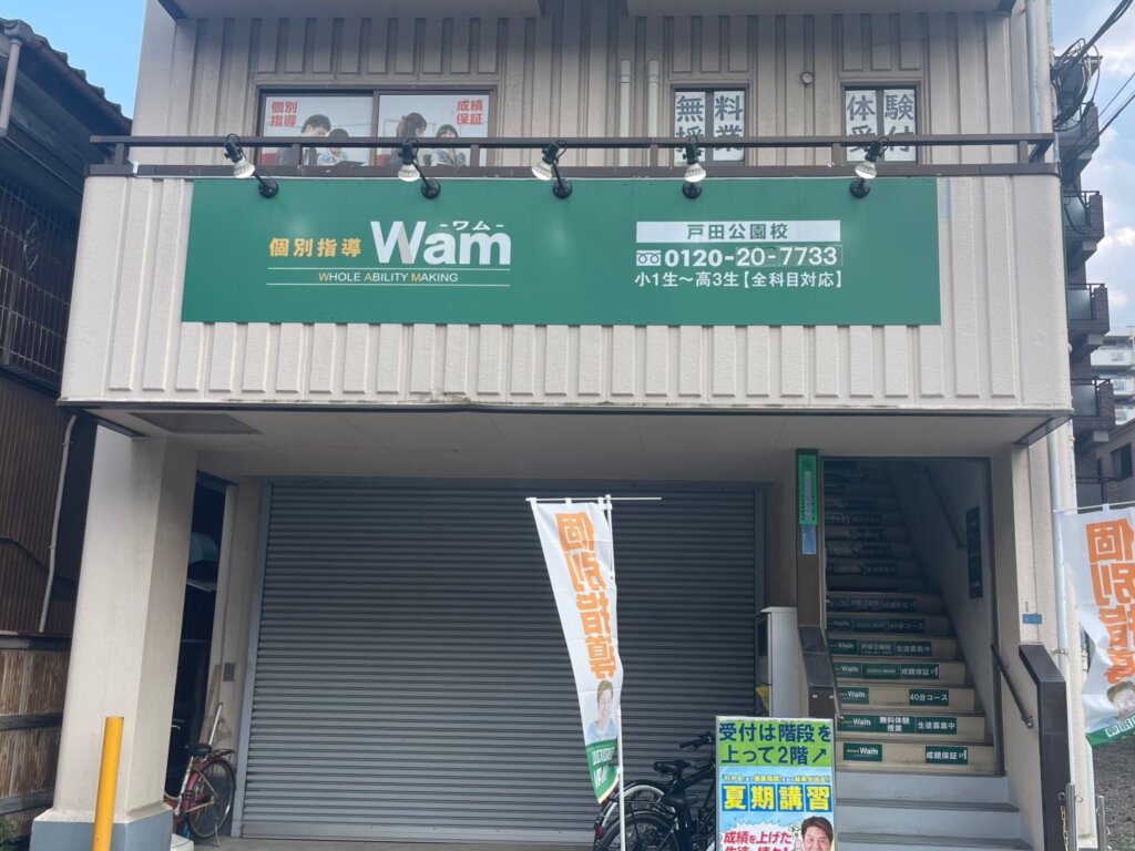 個別指導WAM戸田公園校は戸田公園駅から徒歩15分、下前1丁目の中央通り沿いにある【自習室完備の完全個別指導塾】です。