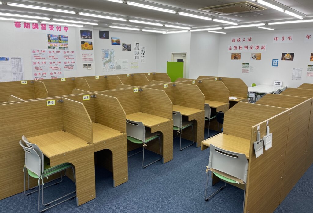 島田金谷校では、教室開放時間内であればいつでも無料で自習スペースを開放しております。空き状況は日によって異なりますので、詳しくはお電話でお問い合わせください。