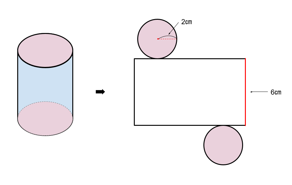 まずは、底面(ピンク)の面積から求めていきましょう。半径2㎝の円の面積は、半径×半径×πなので