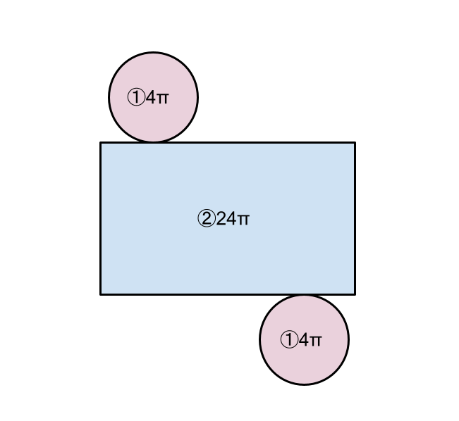 表面積=底面積①×2+側面積②=4π×2+24π=32π と求めることができます。