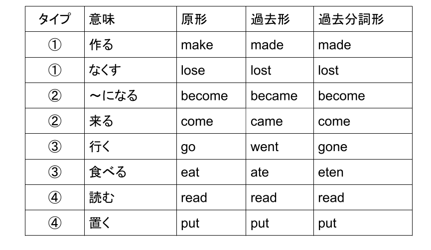 ①.現在形と過去形が異なり、過去形と過去分詞形が同じもの