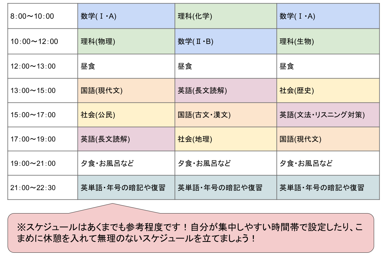 夏休み中は授業がありません。そのため生活リズムが崩れがちになる人もいるのではないでしょうか。夜更かしを続けたり、夜更かしをすることで次の日の午前中を睡眠に充ててしまうなど。受験生に必要なのは、普段通りの生活リズムを保つことです。規則正しい生活を送り、学習習慣を維持するために、スケジュールを立てることはとても大切です。スケジュールを立てることで夏休み中も学校に行っている時と同様に勉強をルーティン化でき、効率のいい勉強ができますね!