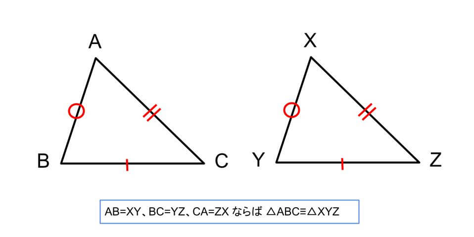 3組の辺の長さが決まると三角形の形は1通りとなるため、この条件を満たすと2つの三角形は合同であると言えます。