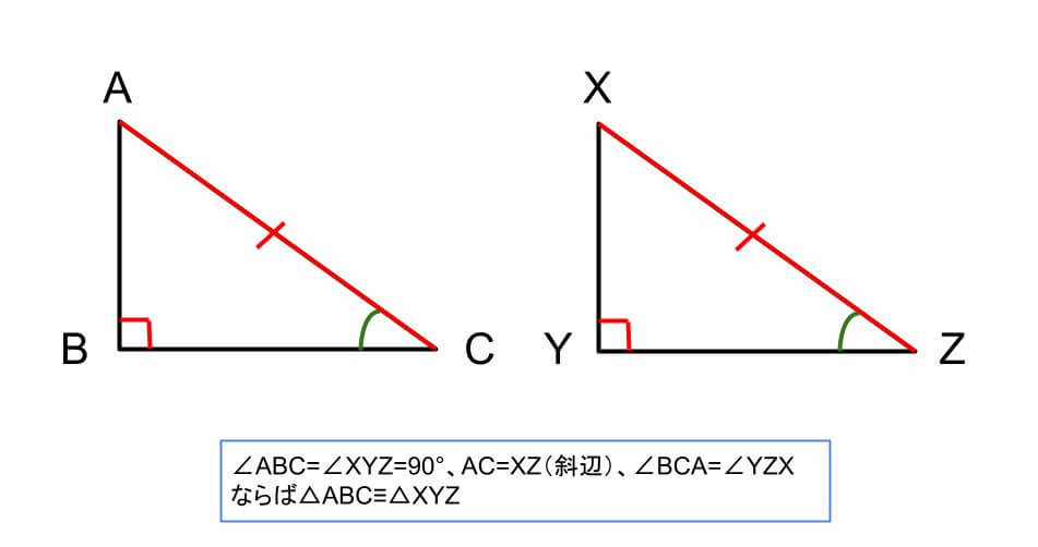 つまり、斜辺の長さと両端の角の大きさが決まることにより三角形の形は1通りとなるため、この条件を満たすと2つの三角形は合同であると言えます。