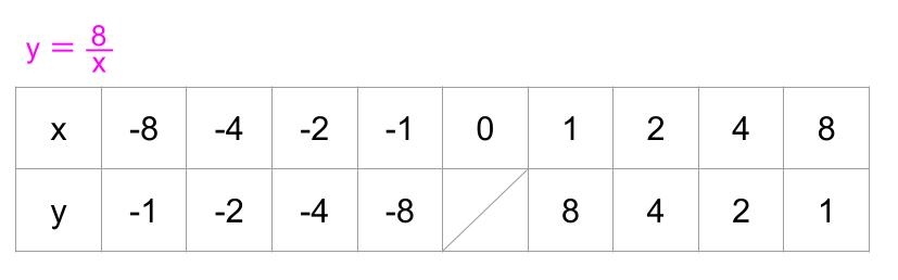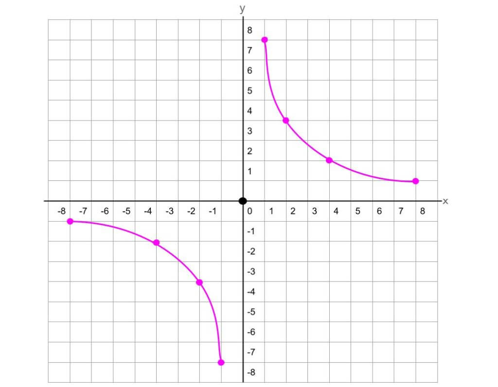 分母である『x』に0 を入れることができないため、反比例のグラフは原点(0)を通りません。なぜ曲線が2つできるのかは、座標を見ると分かりますね。