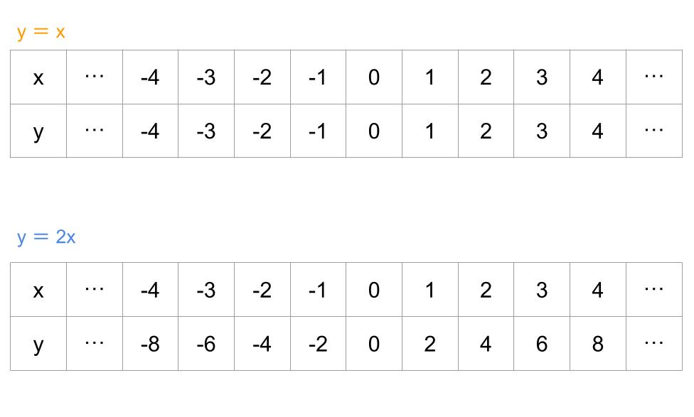 グラフを見ると分かりますが、『x』が 0 の時、y = 1 × 0、y = 2 × 0 となるため、必ず原点(0)を通るということになります。